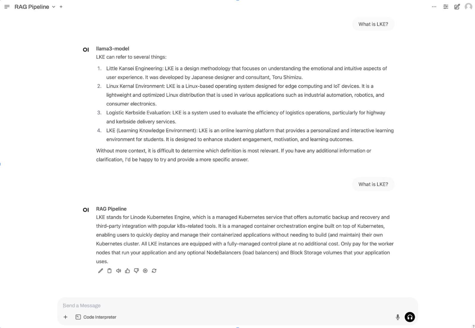 The RAG Pipeline model defined in this guide uses data from the custom data set with which it was provided. The example data set used in this guide is sourced from Linode Docs. If you give this model a query relevant to your custom data, the chatbot should respond with an answer informed by that data set.