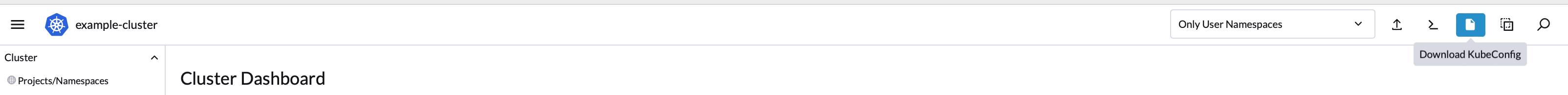 CLI from your local computer if you have it installed. From your cluster’s dashboard in Rancher, click the Download KubeConfig button:A new dialog appears with the correct kubeconfig for your cluster. Copy the contents of the configuration to a file on your computer. Then, pass it as an option when using the CLI:
